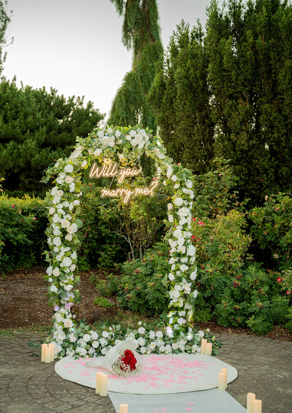 Elevate your proposal with a floral arch adorned with roses, a glowing "Will you marry me?" sign, and a pathway of petals and candle lights in a serene setting. Perfect for a magical, unforgettable moment.